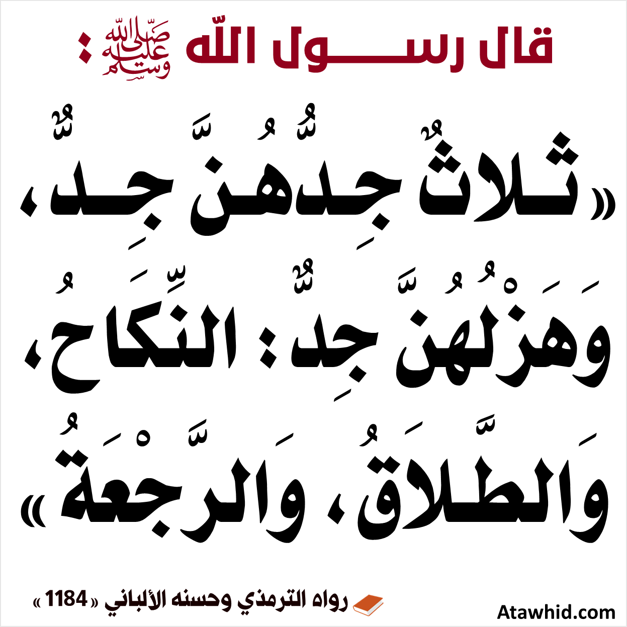 ثلاث جدهن جد وهزلهن جد النكاح والطلاق والرجعة رواه أبو داوود والترمذي وفي رواية أخرى ثلاث لا يجوز اللعب فيهن. عن أبي هريرة قال. عن أبي هريرة قال. قال رسول الله صلى الله عليه وسلم.